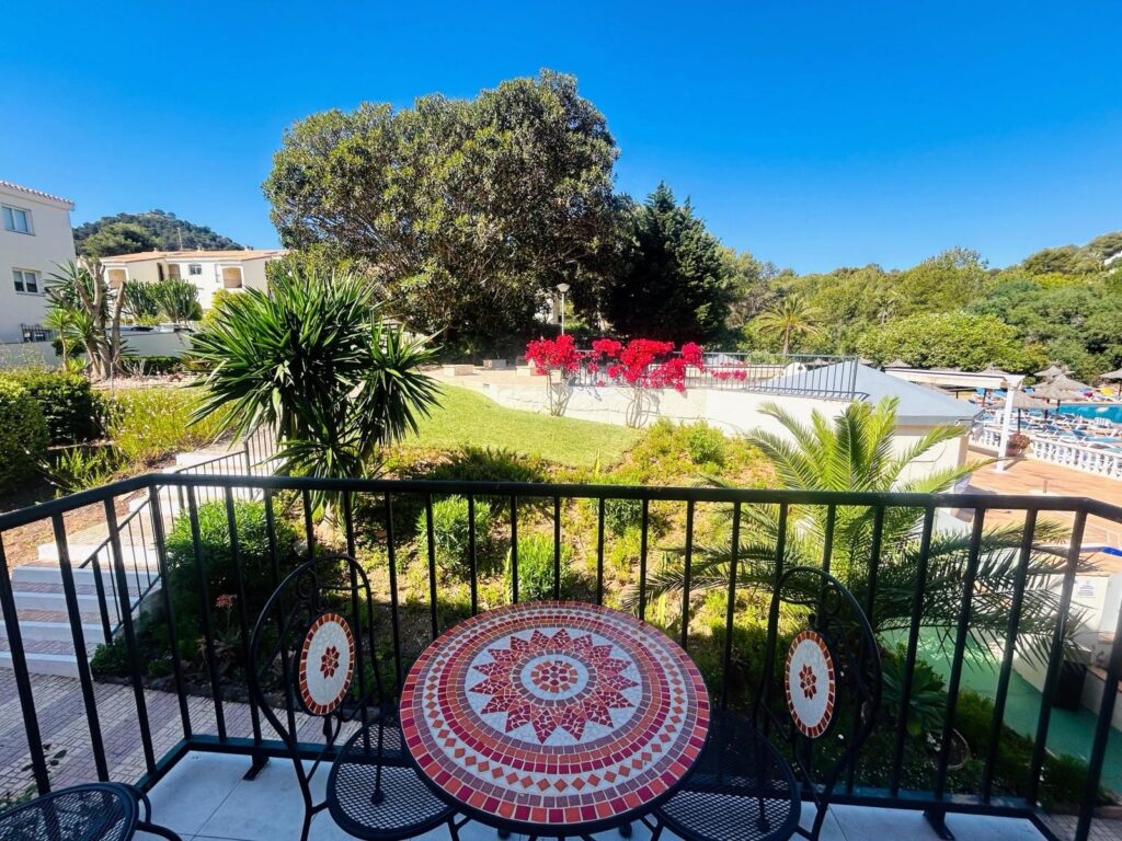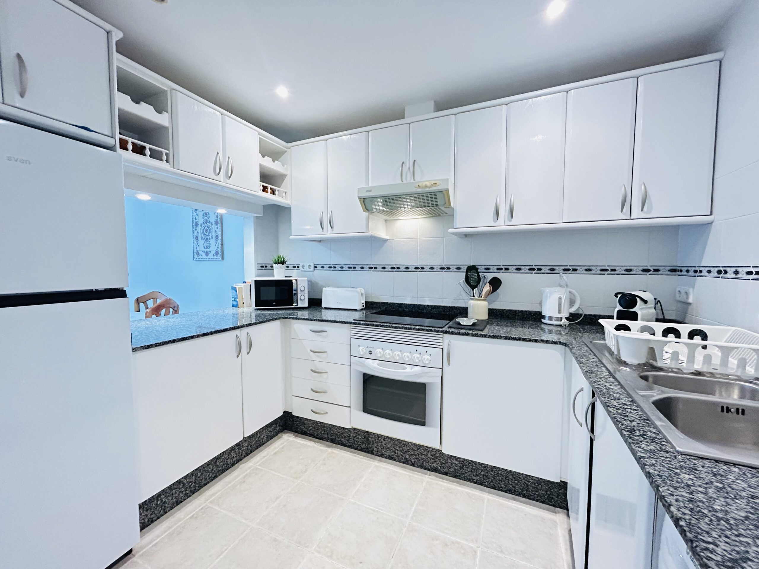 A generously equipped kitchen features all the mod cons you cant live without. Theres an electric ceramic hob and oven with extractor, coffee pod machine and kettle. Toaster, microwave, washing machine and full size fridge freezer. The dining room has an extendable dining table an a large ceiling fan for keeping you cool. There are patio doors that lead out to a balcony that offer you fabulous view of the swimming pool and gardens at the rear of the apartment.
