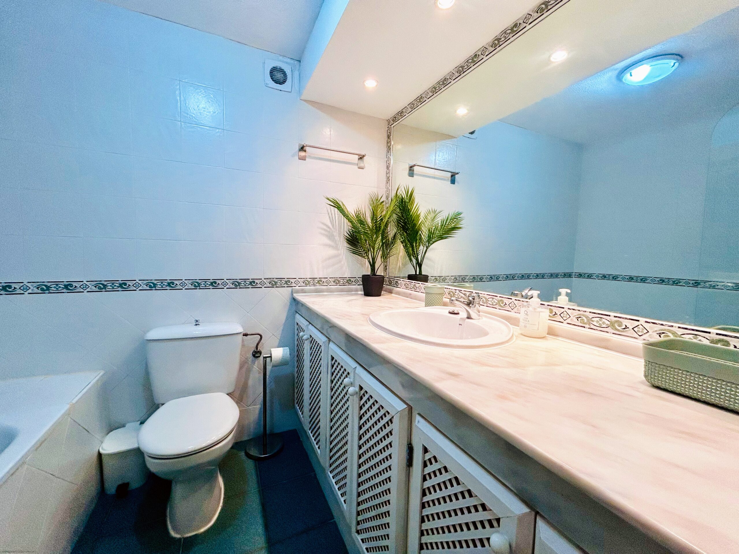 The fresh bathroom has a full size bath for soaking away the cares of the day and and up and over shower facilty. Theres a large vanity mirror and handwash basin. under the counter storage and a toilet. A hairdryer is supplied for your convenience.