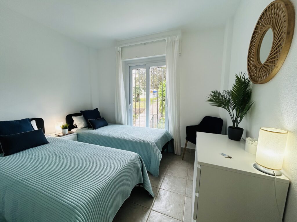 You will find 2 single beds that can be easily adapted to king if required and 2 bedside cabinets. There are floor to ceiling fitted wardrobes for all those holiday essentials and a large chest of drawers.