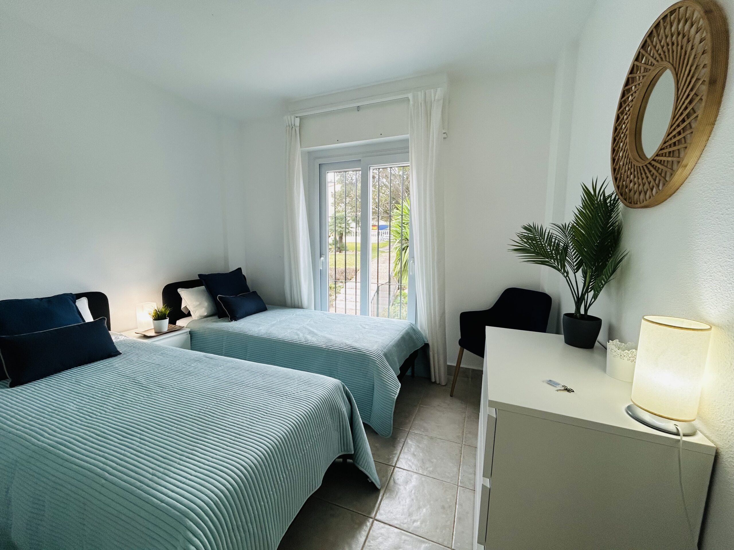 Again like the primary suite this bedroom has 2 single beds that can be adapted to king size if preferred. There is ample wardrobe space and a bedside cabinet with a chest of drawers. There is a juliet balcony with fabulous views of the mature gardens and swimming pool.
