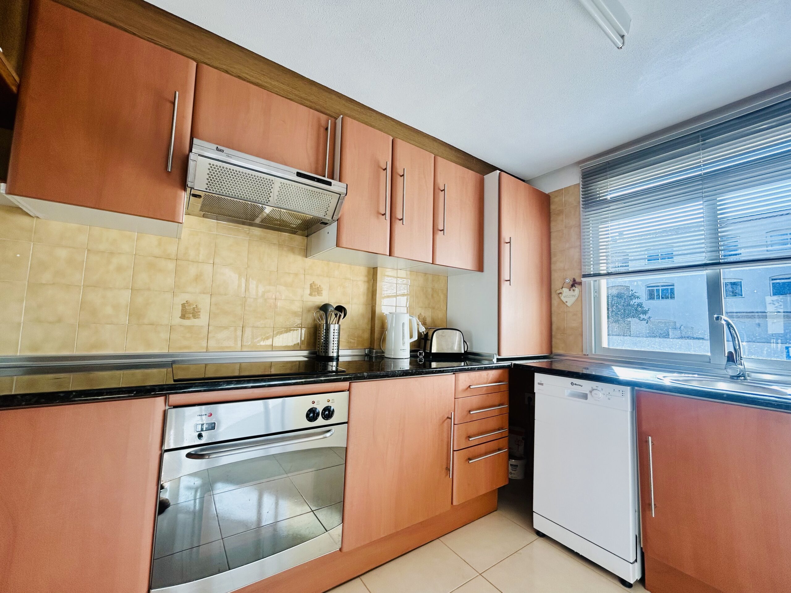 This kitchen is at the front of this Bellaluz property and is well equipped with plenty of counterspace. You can cook up a storm and then stash everything in the dishwasher. The kettle sits next to the coffee pod machine and the toaster is housed nearby. Washing the essentials is a breeze in the washing machine and the full size fridge freezer is big enough to accomodate the beer and wine supplies.