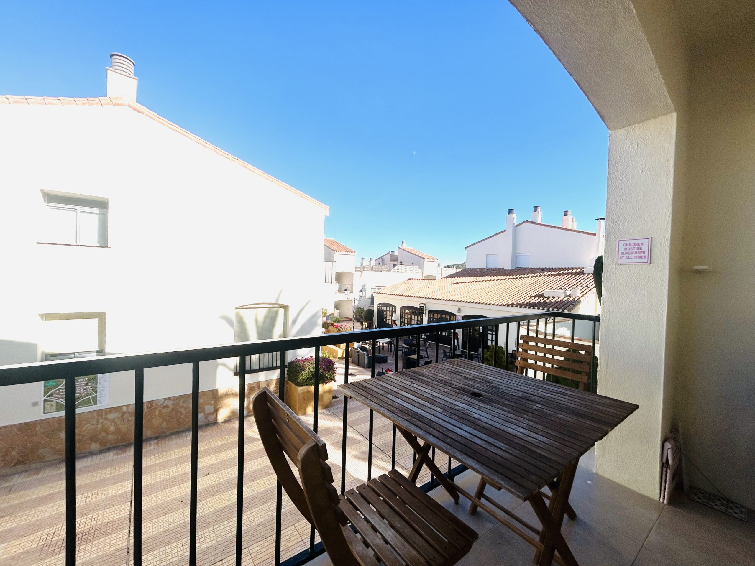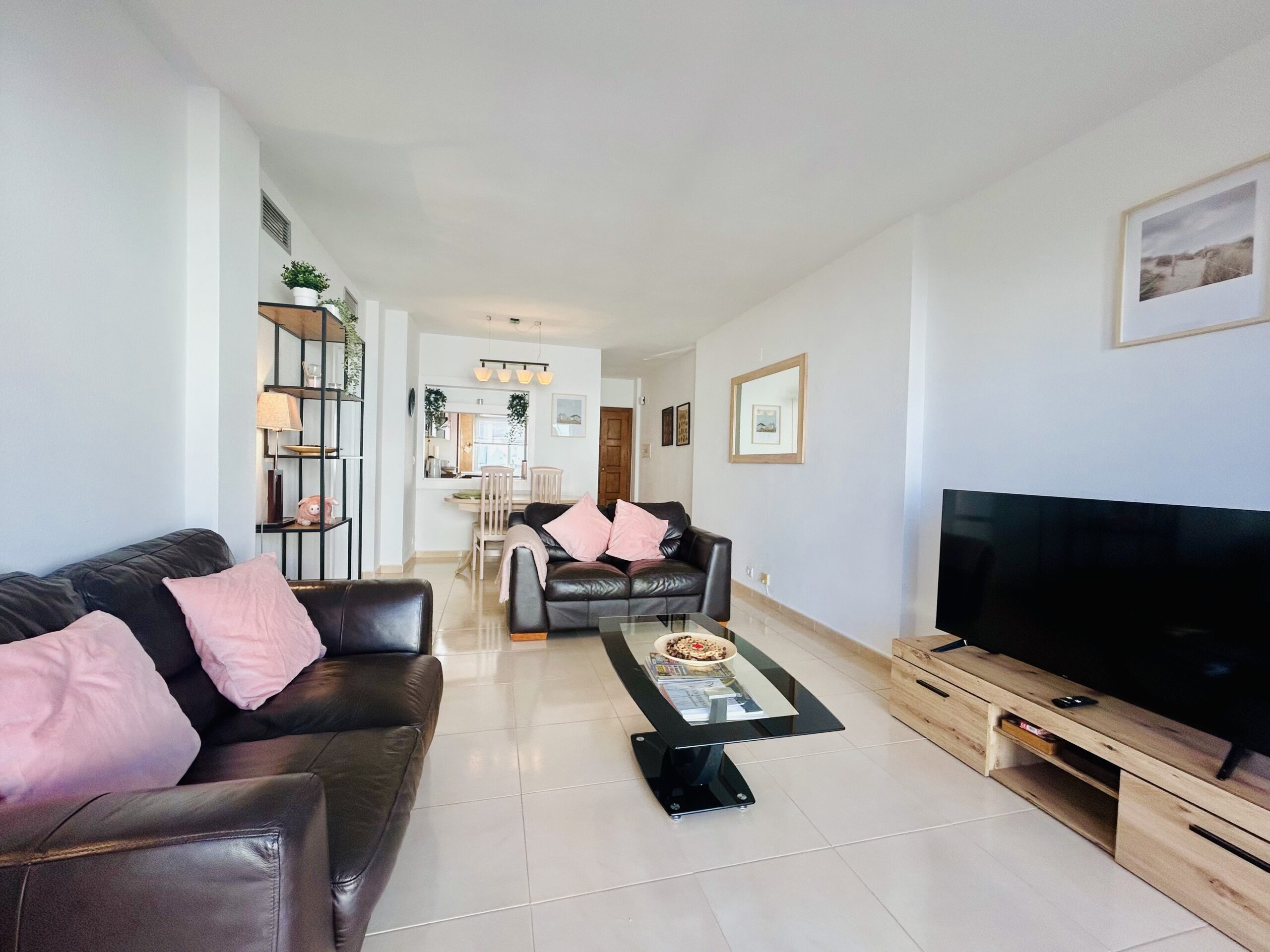 The lounge is comfortably furnished with 2, 2 seater leather sofas. There is a large flat screen TV with a full English TV Package for the ever popular soaps and sporting events that you dont want to miss out on. Patio doors take you to the rear of the property where you can enjoy a cup of tea on the balcony in the shade when the sun gets too hot to bare. There is a large dining table with overhead lighting and ample seating for 6.