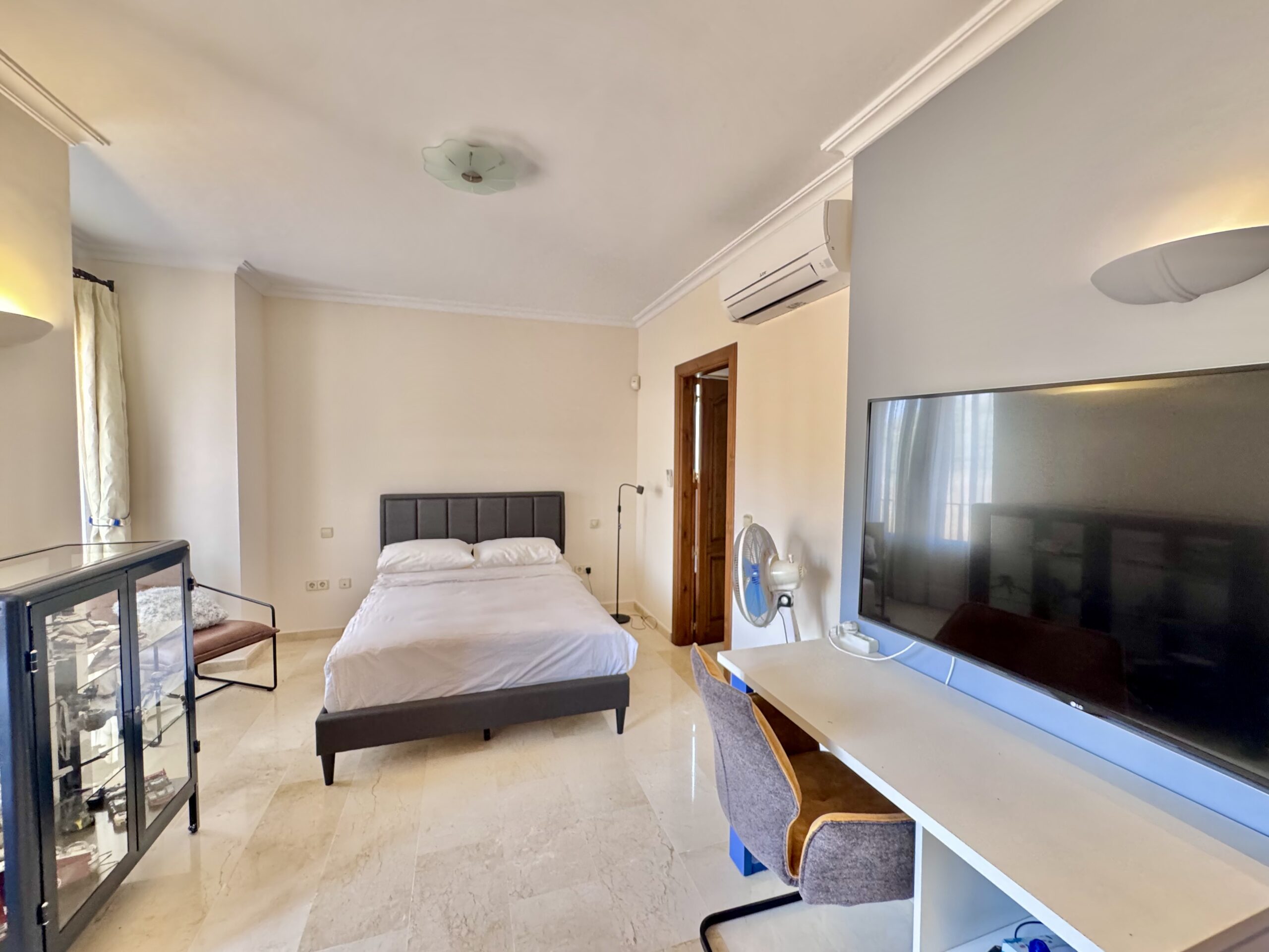 Upstairs, the second level hosts three generous bedrooms. Two enjoy private en-suites while the third is served by its own bathroom – perfect for family and guests. Polished marble floors run throughout, adding elegance to every space.