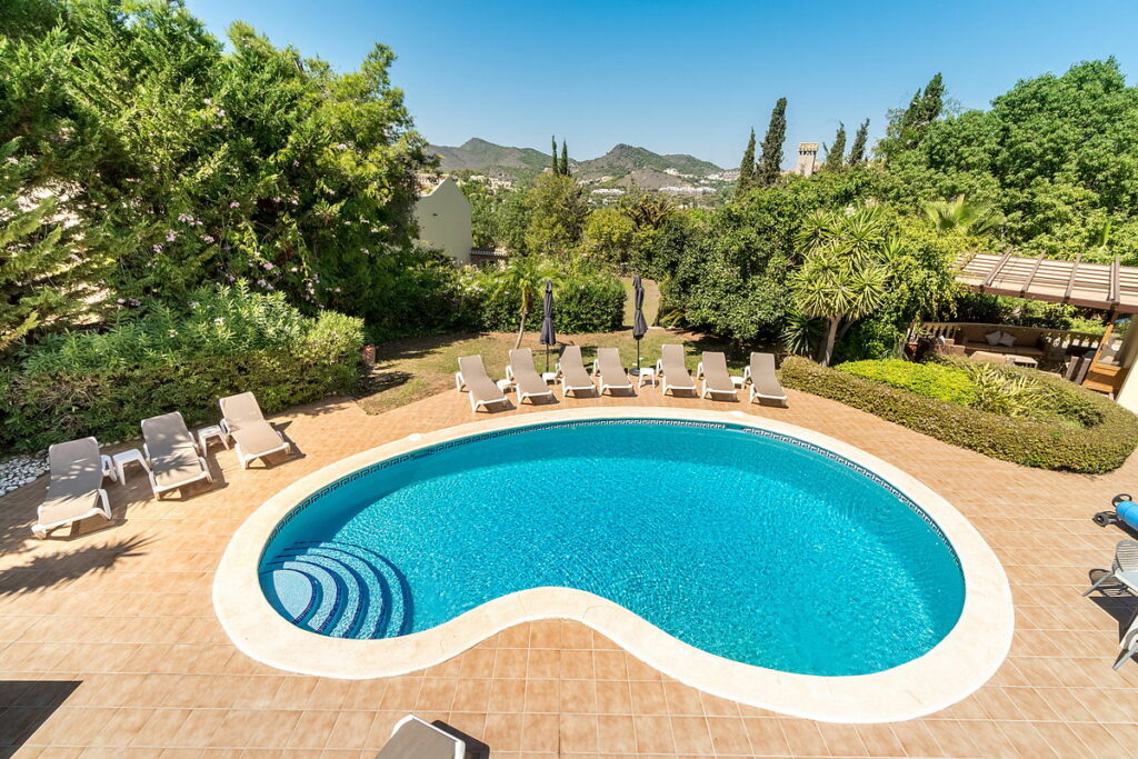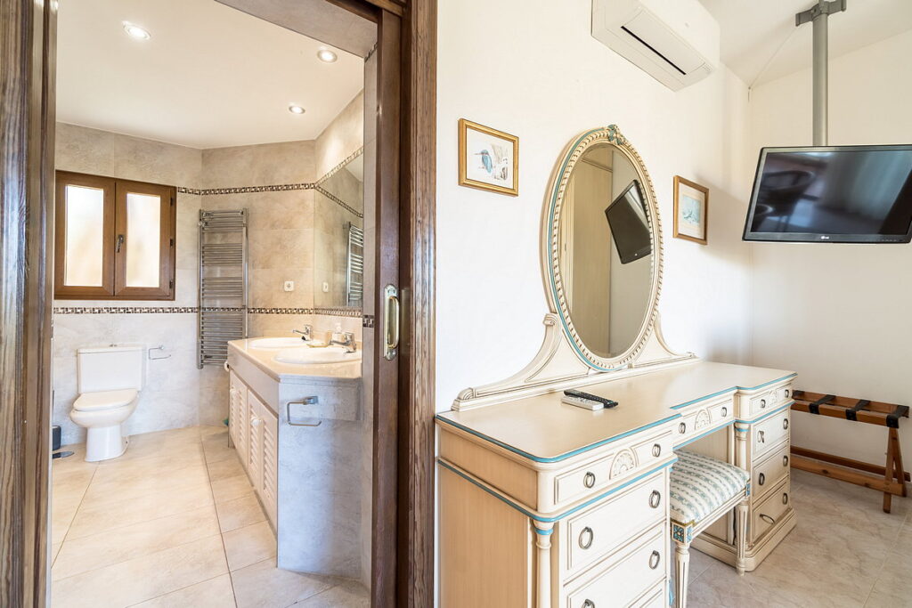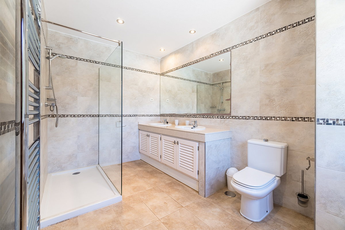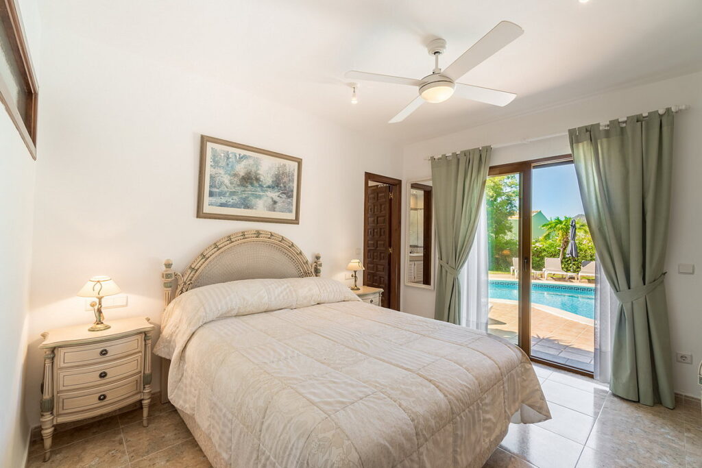 To the right of the pool, there is an annex with another en-suite bedroom and a private terrace, also covered with a pergola and retractable canvas awning. Next to the annex, there is an additional toilet and shower for pool users’ convenience.