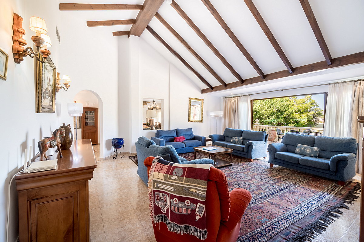 The living room features a high ceiling with exposed wooden beams and large sliding doors that open onto a spacious terrace, which runs the full length of this floor.