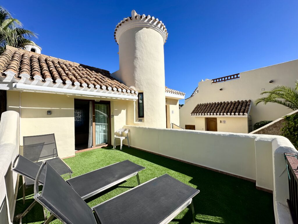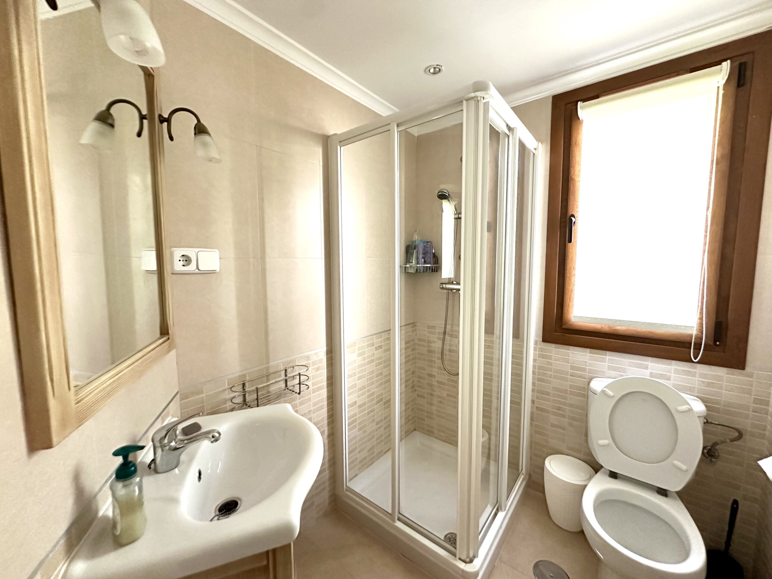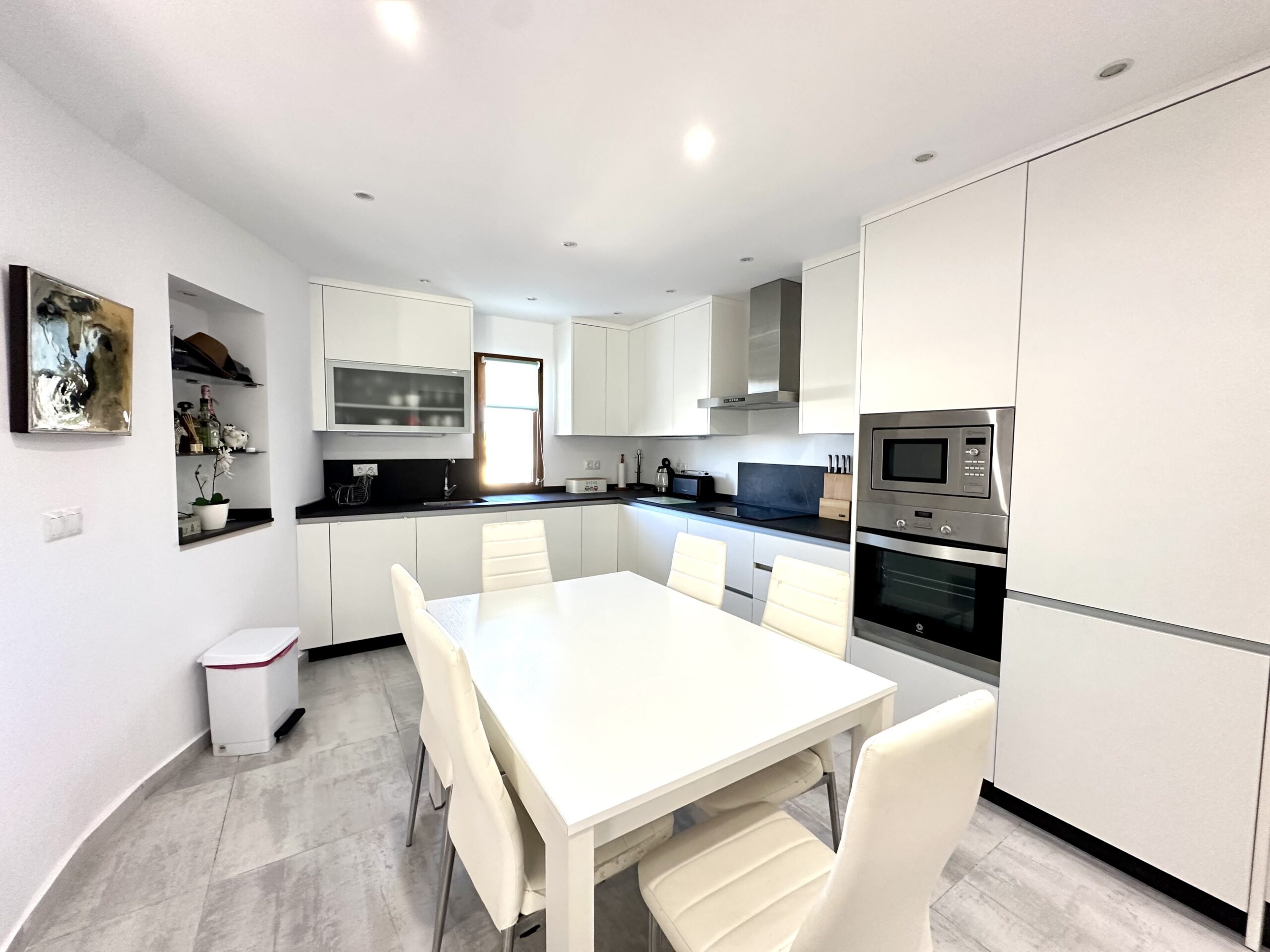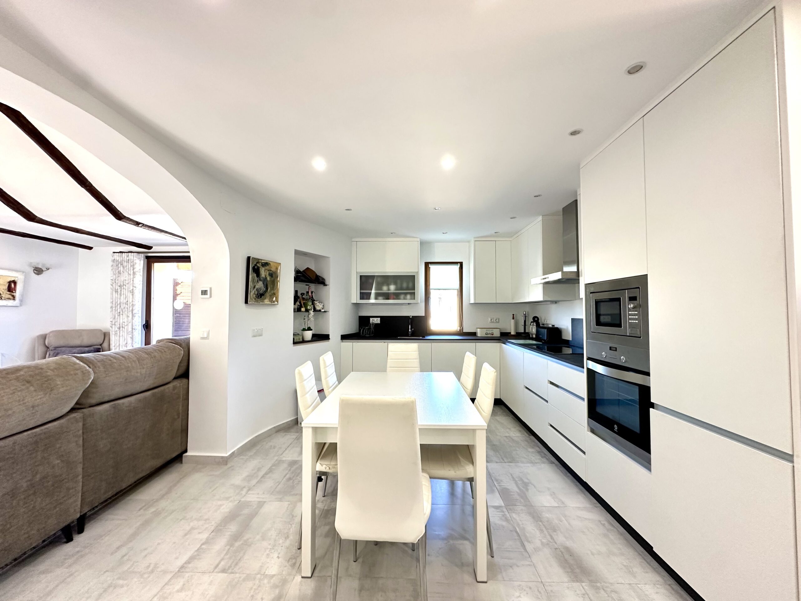 As you enter, you’re welcomed into a bright, open-plan kitchen and living area, thoughtfully renovated to the highest standards. The space retains its traditional Spanish charm with exposed ceiling beams, with contemporary finishes and a seamless layout . From the living room, two spacious terraces extend outwards, offering the perfect settings to enjoy both the morning and evening sun. Take in beautiful views while dining al fresco or simply relaxing