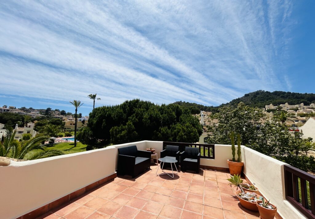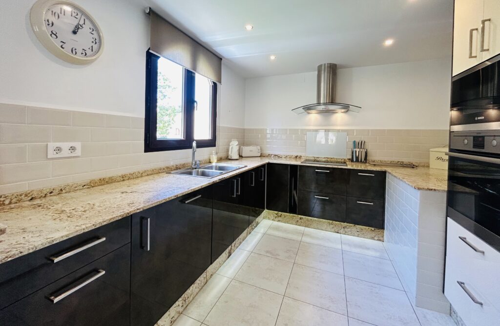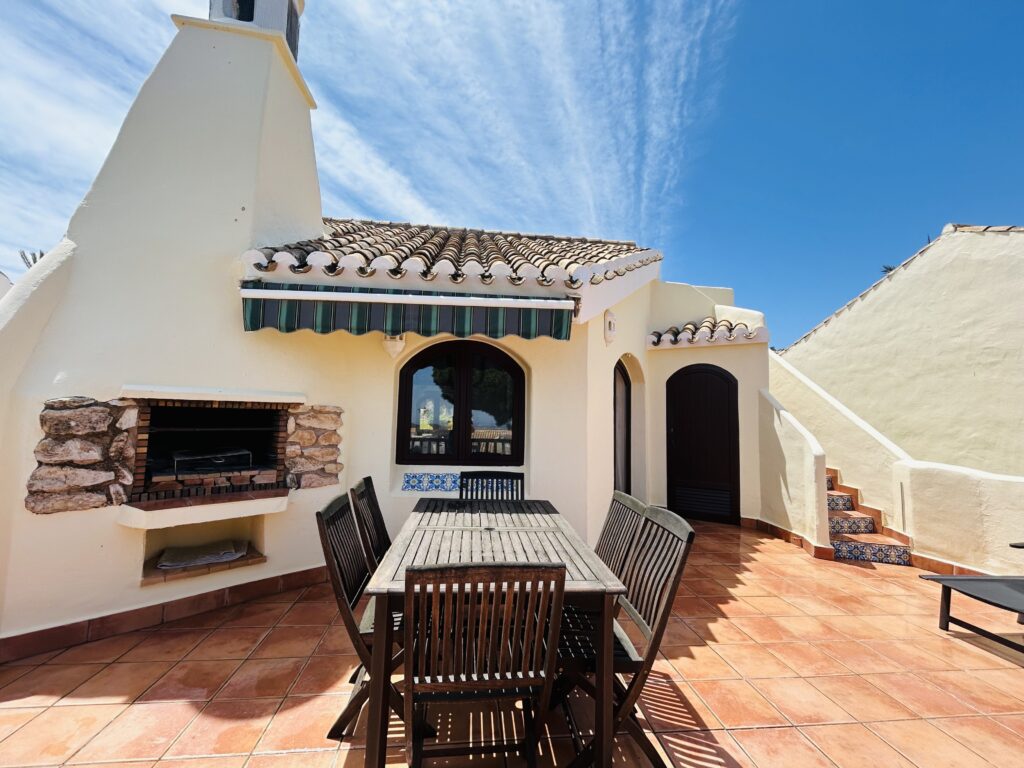 The lounge area has ample seating and there is a cozy log burner if you are here during the cooler months. There is full English TV so you wont miss out on your ever important soaps and sporting events. The dining table seats 6 for the nights that you want to cook-in and not venture out. There are patio doors that take you out to an expansive furnished BBQ terrace offering stunning views of Mar Menor. A external staircase leads you upto a large rooftop solarium, ideal for topping up your tan. El Rancho features 9 swimming pools all with grassed areas so this villa doesnt disappoint. Literally on the doorstep of this villa is a gorgeous swimming pool so if you get a little hot under the collar, you dont have to far to go to chill down.