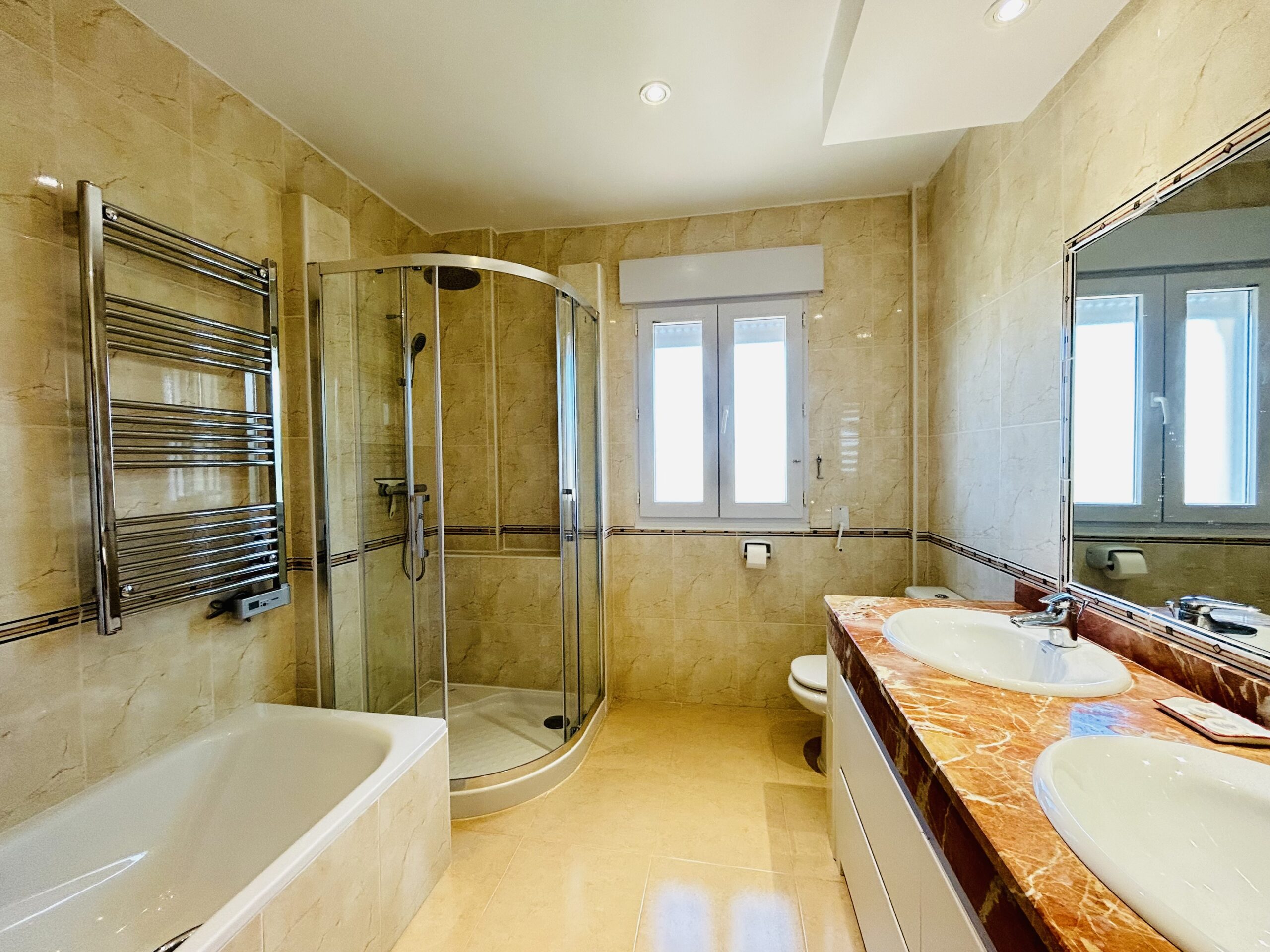 In the family bathroom you´ll find a large corner shower, toilet and dual hand wash basins and a heated towel rail.