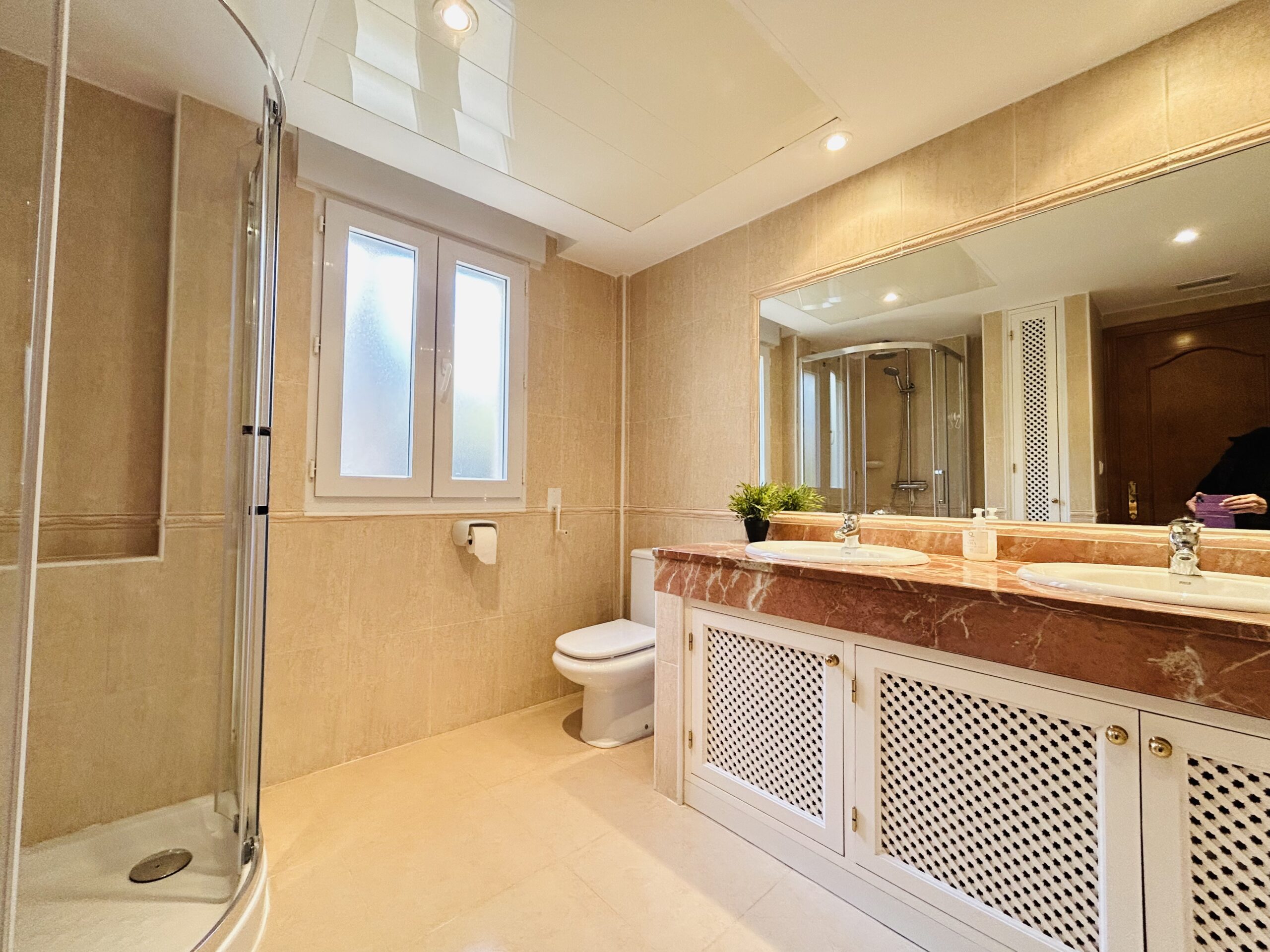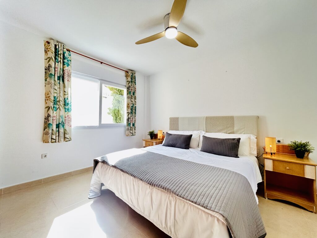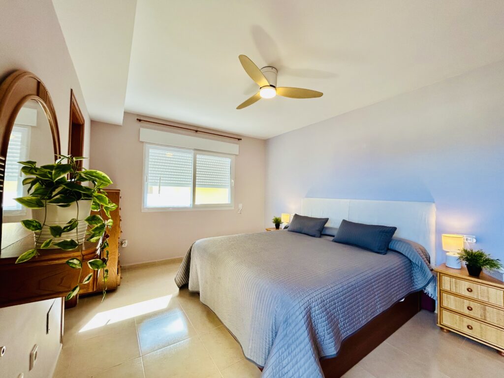 The primary bedroom is large and bright with sunlight flooding in through the patio doors and large windows.  There is a large double bed that is shouldered with bedside cabinets and plenty of storage space in the ample wardrobes to house all your holiday essentials.  If you dont like to have the ac on during your stay there is a large overhead fan. The ensuite bathroom has a large corner shower, full length bath and dual aspect hand wash basins with a large overhead vanity mirror.  A hairdryer is supplied for your convenience.
