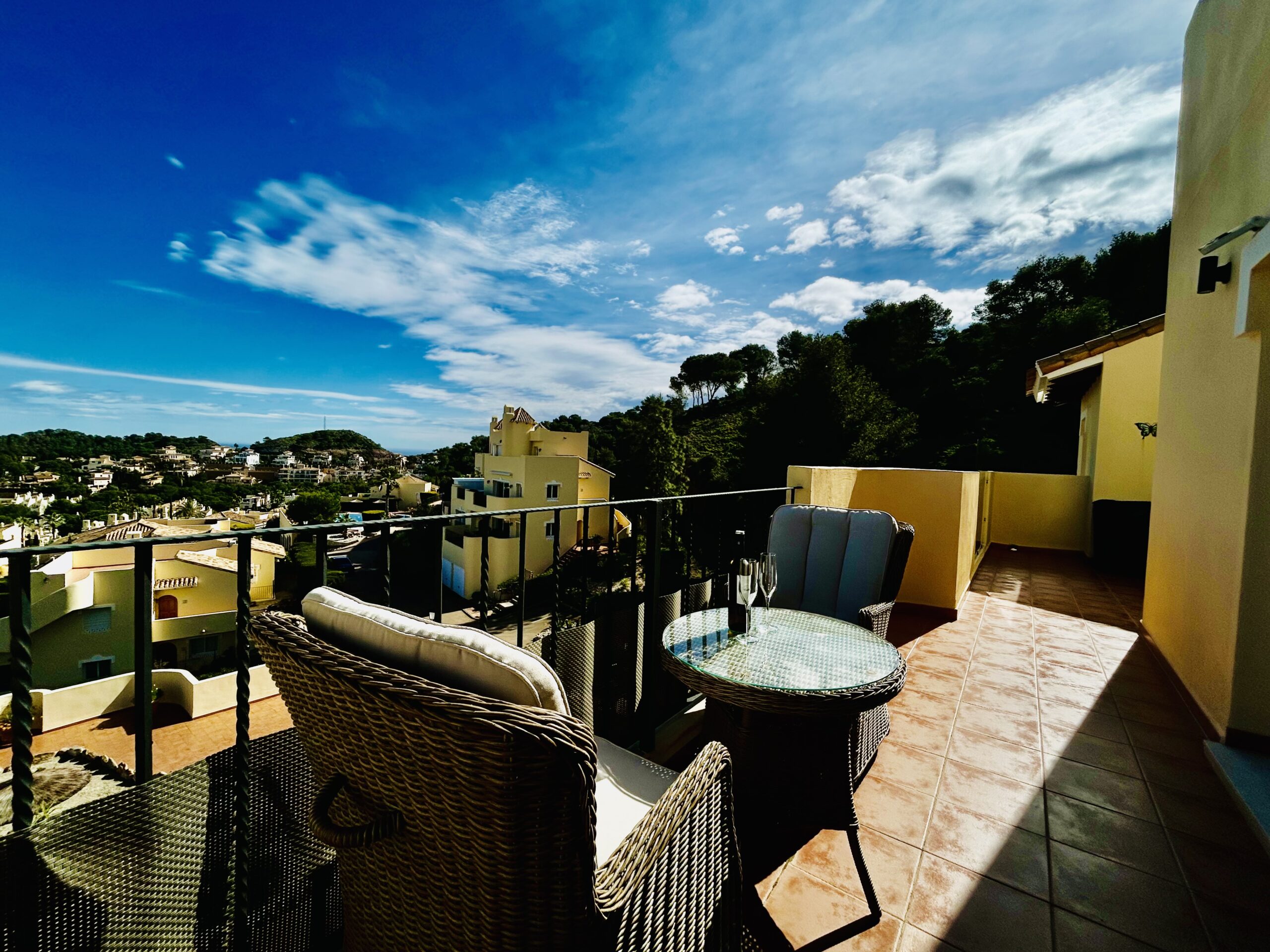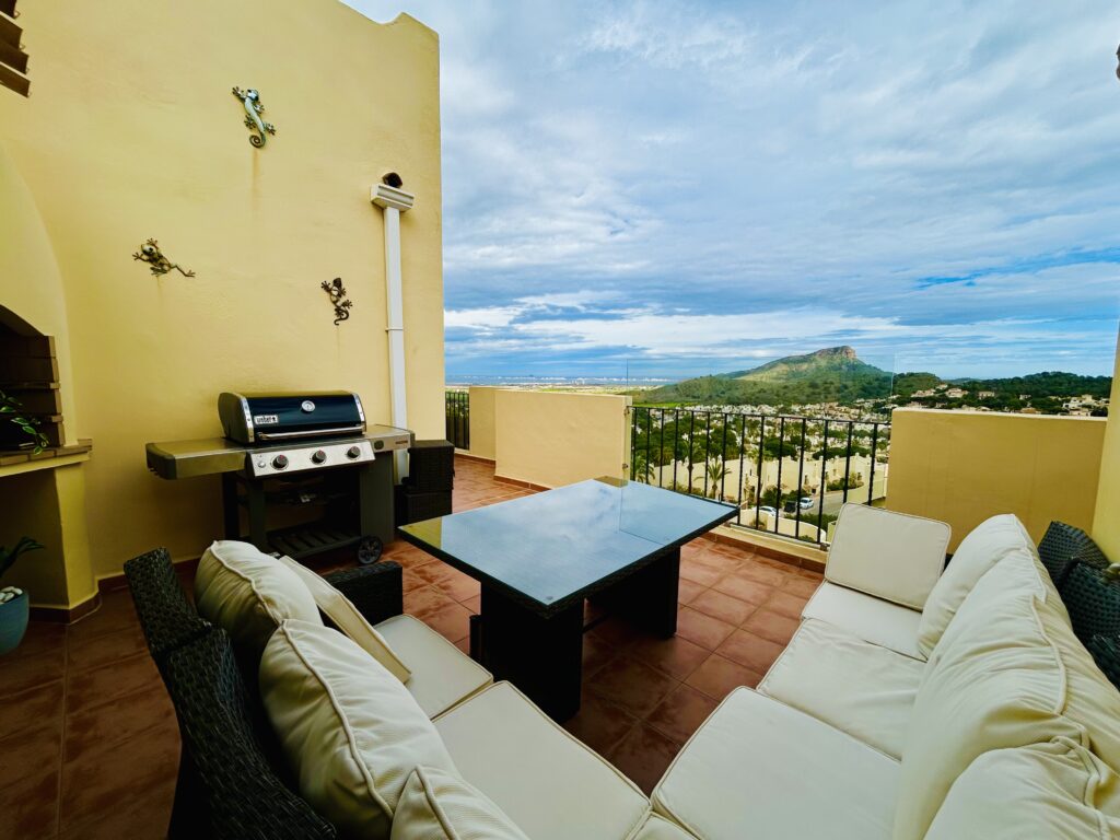 Monte Verde apartments are the envy of La Manga Club offering the best views of La Manga Club, Mar Menor, La Manga and surrounding areas. The lounge has huge french windows taking you out to the furnished terrace. Theres a large corner sofa, awning and gas fired BBQ for dining al-fresco in the warm barmy air.